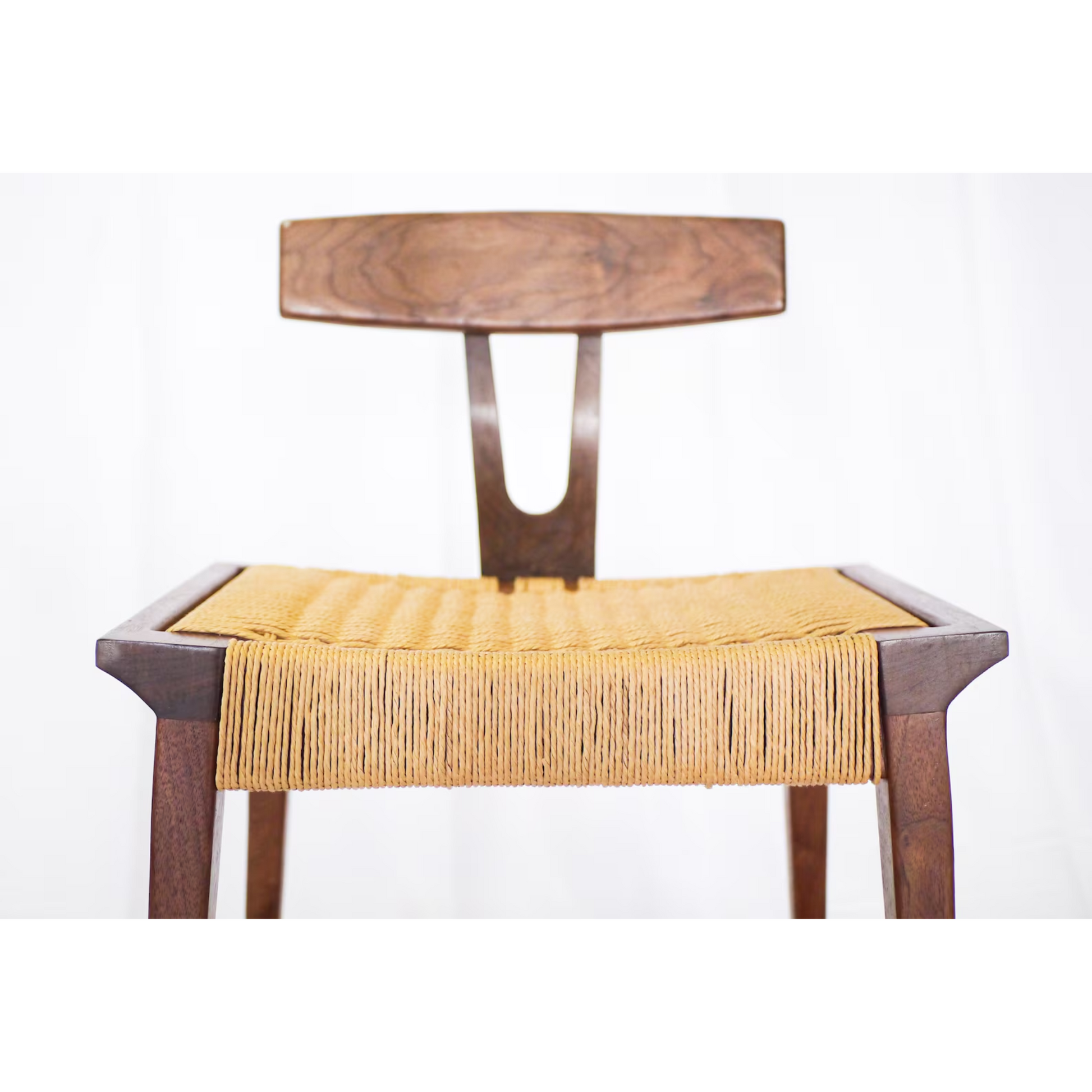 Hand-built by Georgia maker Matt Worsham, this stool pairs a sculpted black-walnut frame with a hand-woven Danish-cord seat and a graceful wishbone-style back. Mortise-and-tenon joinery, a semi-gloss hard-wax finish, and three seat-height options (dining, counter, bar) make it a versatile, heirloom-grade perch for kitchens, islands, and high tables. Removable back ships detached for safety; slide it on, tighten two bolts, and you’re ready to sit. Custom wood species or heights welcomed—just ask.