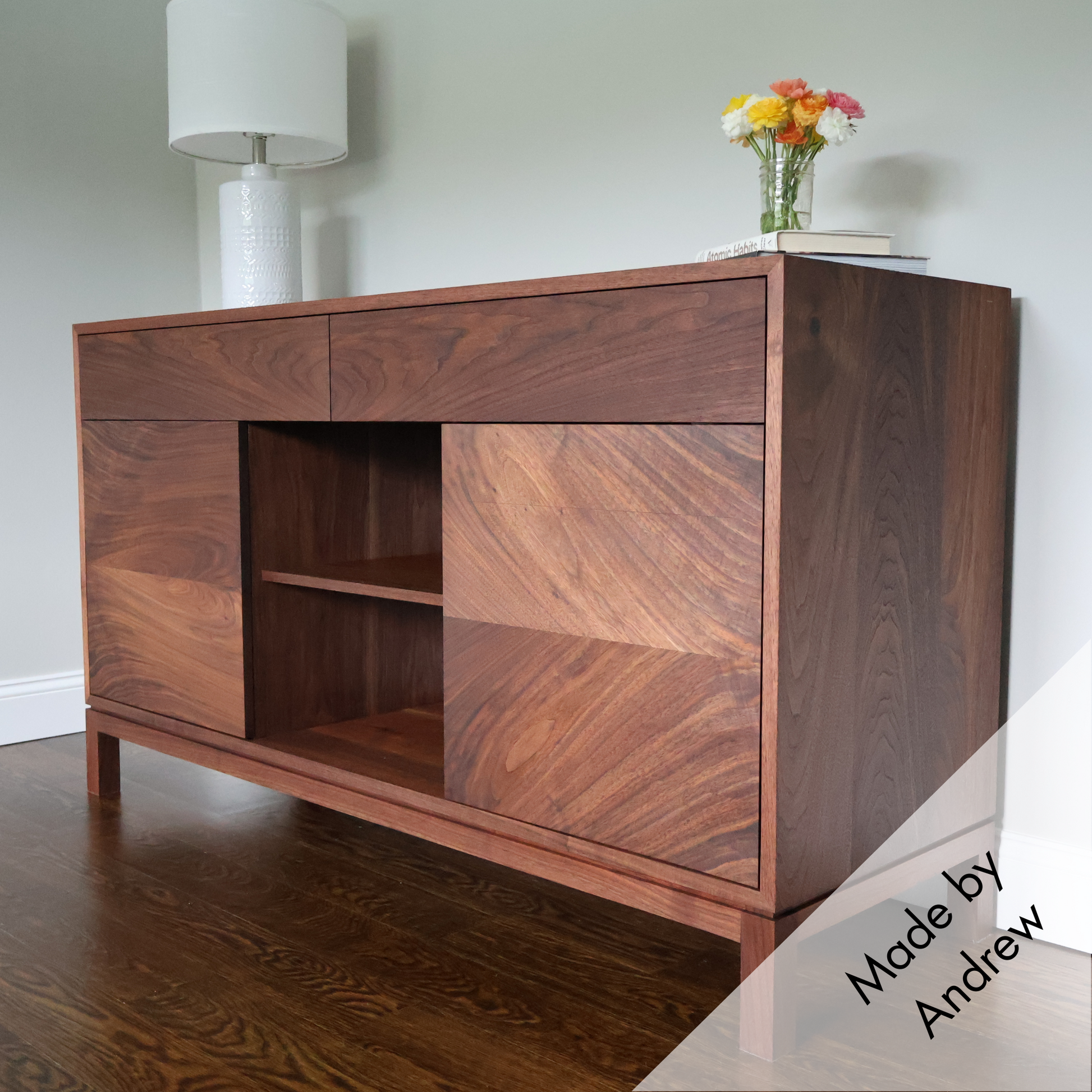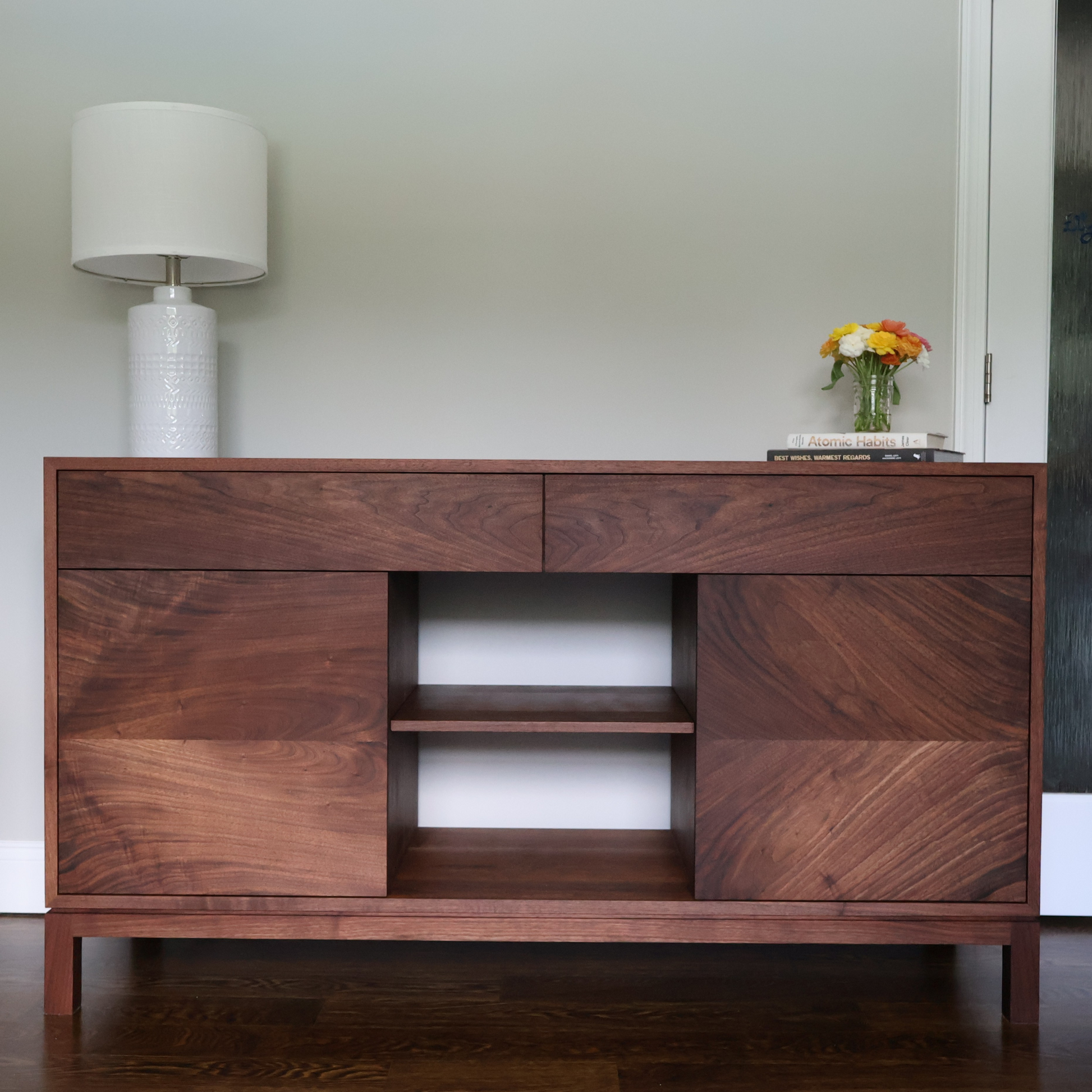 Every credenza is made to order in Andrew Schatz’s Pennsylvania shop, wrapped in continuous waterfall grain that flows unbroken across each mitered corner. Two leather-lined drawers conceal integrated power (110 V, USB-A & USB-C), while twin 19″-square, 20″-high cabinets and an adjustable center shelf keep gear or dinnerware organized—all hidden behind solid-walnut fronts.